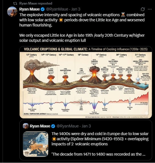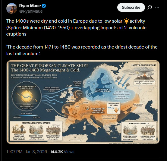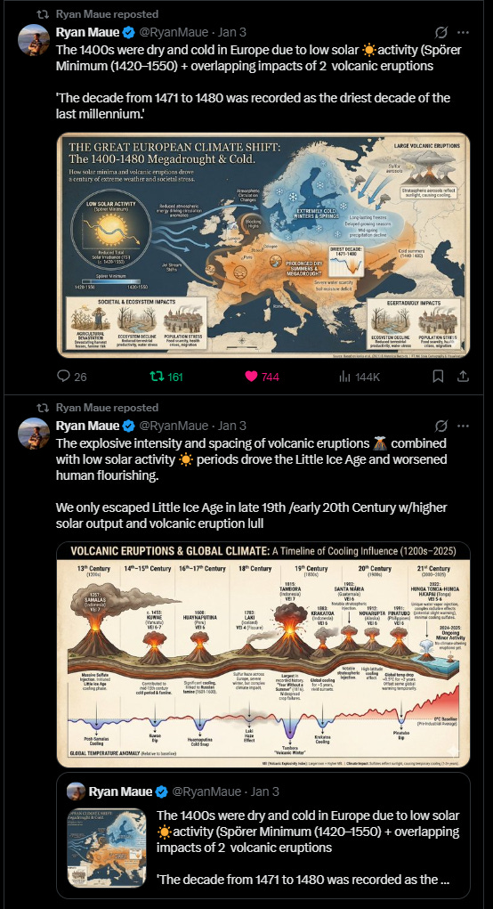 During the Little Ice Age (1300-1850), the worst of the cold occurred during the Maunder Minimum. David DuByne is correct in my HMO about what will happen politically to the world’s political powers and their populations when the food shortages really kick in.