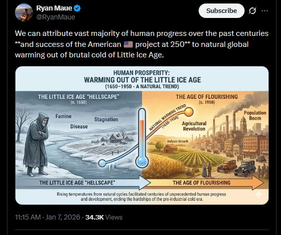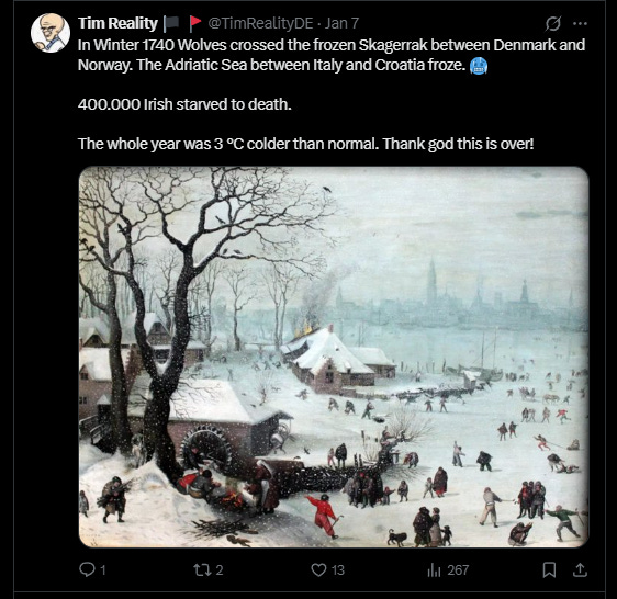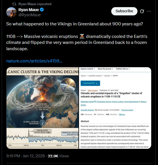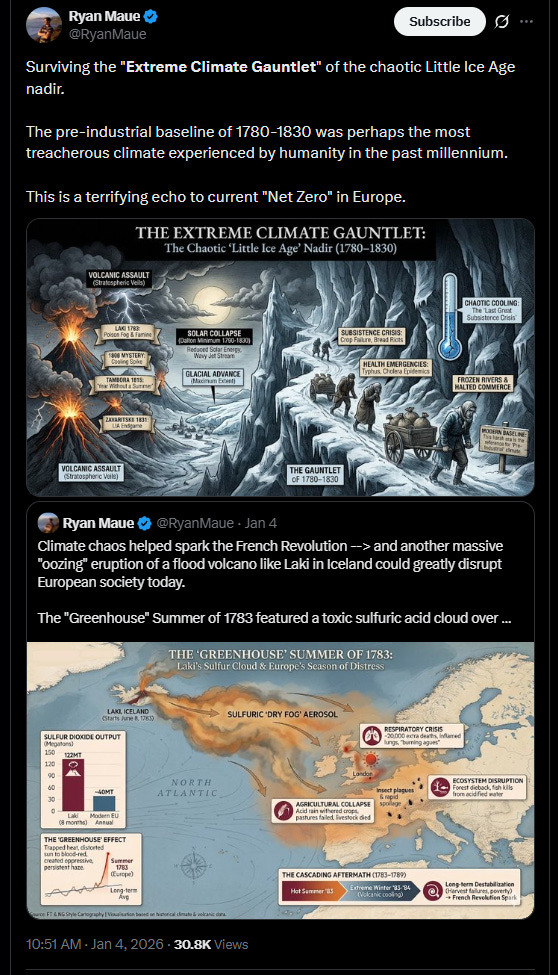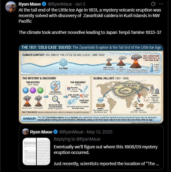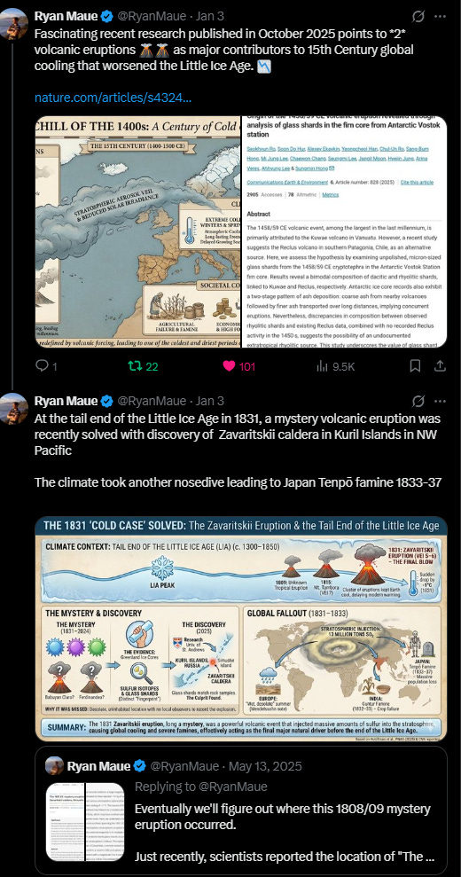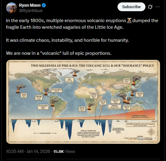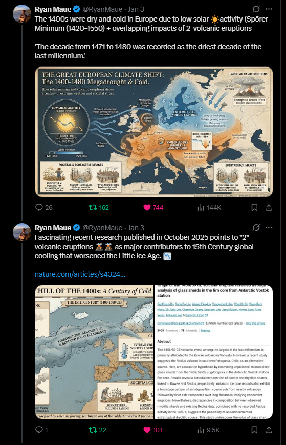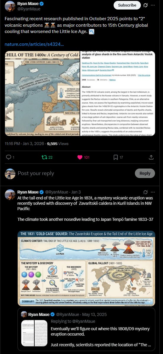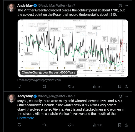 The definitions for the beginning and end of the LIA differ considerably, depending on the region and dataset used. The LIA in the Northern Hemisphere started between 1200 and 1400 AD. In the Southern Hemisphere the beginning of the LIA was delayed by about two centuries.[25]Copied from my weather blog post on January 17, 2026: