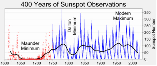 The Maunder Minimum, also known as the "prolonged sunspot minimum", was a period around 1645 to 1715 during which sunspots became exceedingly rare. During the 28-year period 1672–1699 within the minimum, observations revealed fewer than 50 sunspots. This contrasts with the typical 40,000–50,000 sunspots seen in modern times over a similar timespan.[1]
