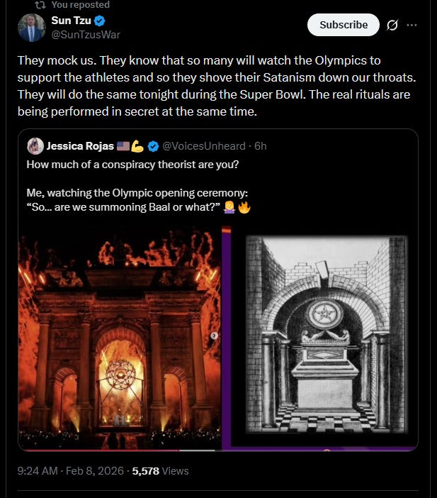 Most people missed this, but did you know that Andrea Bocelli sang Nessun dorma at the 20” at the 2026 Olympic opening ceremony? The irony here is that this song has become a hallmark of President Trump’s appearances and rallies. Do you think maybe the White Hats were sending a message (com) to the Deep State and Globalists while they opened up with their Santaic Rituals and symbolism? I certainly do.